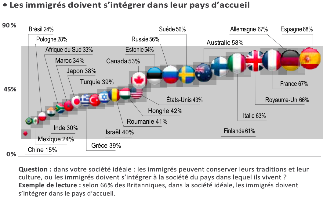 À la lecture de ces résultats, on aura relevé que les jeunesses les plus favorables à une perpétuation des traditions et de la culture des immigrés dans leur pays d’accueil sont issues des pays d’émigration : la Chine, le Mexique, la Pologne, l’Inde ou le Maroc. À l’inverse, les jeunes des pays accueillant un nombre important d’immigrés sont les plus attachés à l’idée d’intégration : l’Allemagne, la France et le Royaume-Uni. Ce mécanisme joue au niveau européen, entre une Europe de l’Est favorable à une conservation de