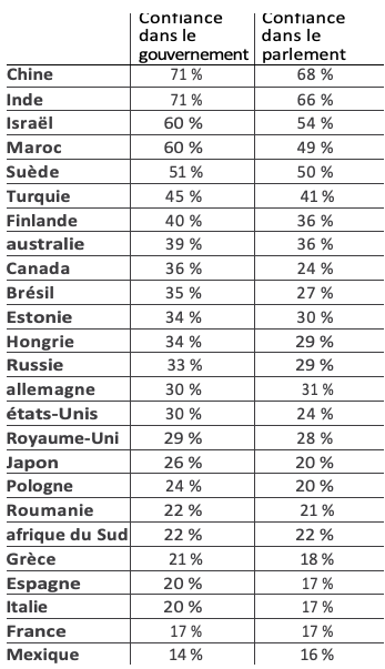 Alors que 71% des Chinois et Indiens expriment leur confiance dans leur gouvernement, le scepticisme domine la jeunesse européenne, au sein de laquelle seuls les Suédois se disent majoritairement confiants dans leur gouvernement (51%). Les Marocains et Israéliens témoignent également d’un fort sentiment de confiance à l’égard de leur gouvernement (60%). À l’autre extrémité, on trouve les Mexicains (14%), les Français (17%), les Espagnols et les Italiens (20%). La confiance dans le parlement national est toujours très faible dans les pays où la jeunesse est particulièrement défiante envers son gouvernement, ce que confirment les résultats en Grèce, en Pologne, en Roumanie ou en Afrique du Sud, où la confiance dans ces deux institutions ne dépasse pas non plus le quart des jeunes enquêtés.