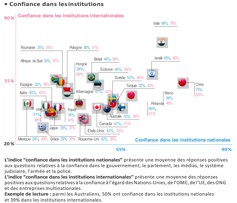 Enfin, les médias sont également frappés par cette crise de confiance, notamment au sein de la jeunesse européenne, où seuls les Finlandais leur font majoritairement confiance (61%). La confiance envers les médias est plus forte en Europe de l’Est (Estonie 47%, Roumanie 35%, Pologne 32%) qu’en Europe de l’Ouest (Italie 20%, France 23 %). Les Indiens (72%), les Israéliens (58%), les Chinois (54%) et les Marocains (53%) se montrent les plus confiants envers leurs médias.