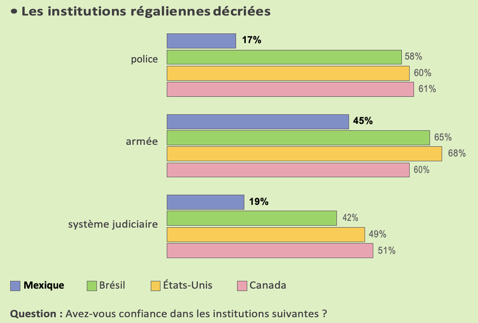 Les Mexicains expriment une défiance record à l’égard de toutes leurs institutions nationales, à l’exception de leur armée. Un tiers accorde sa confiance aux médias et aux institutions religieuses, mais surtout seuls 14% des Mexicains font confiance à leur gouvernement et 16% à leur parlement. La confiance que la jeunesse mexicaine place dans sa police (17%) et son système judiciaire (19%) est à peine plus forte. Plus spectaculaire encore, la jeunesse mexicaine exprime même une faible confiance (44%) envers les gens en général.
