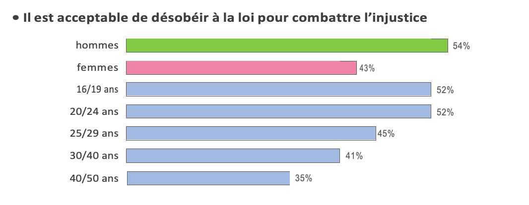 La jeunesse se déclare disposée à la révolte face à l’injustice. Au plan global, près d’un jeune sur deux (49%) est d’accord avec l’affirmation selon laquelle il est acceptable de désobéir à la loi pour combattre l’injustice dans la société. Cet accord est partagé en moyenne par 47% des jeunes Européens (contre 44% qui sont en désaccord) et par 42% des Britanniques, 51% des Grecs, 57% des Français et 60% des Espagnols.