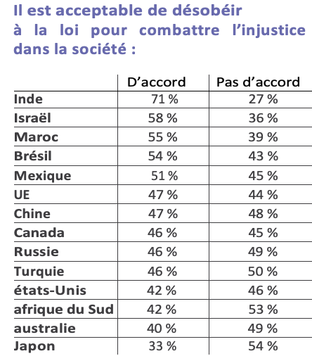 Les jeunesses des grandes démocraties émergentes approuvent cette affirmation, qu’il s’agisse des Brésiliens (54%) ou plus encore des Indiens (71%). Enfin, et c’est peut-être l’un des résultats les plus notables de notre enquête, 47% des Chinois interrogés disent être d’accord avec l’idée qu’il est acceptable de désobéir à la loi pour combattre l’injustice dans la société.
