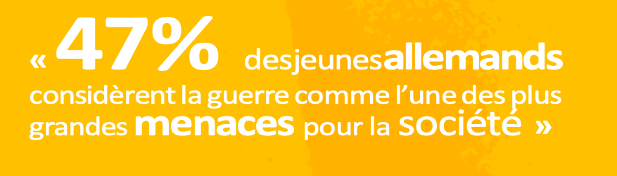 Interrogés sur ce qui constitue selon eux les plus grandes menaces pour la société, les Allemands sont 47% à pointer « la guerre », à égalité avec « la pauvreté et la famine » (48%). La peur de la guerre devance la crainte du chômage, de l’effondrement du système financier, du terrorisme ou encore de la pollution. Notons que cette peur de la guerre est en baisse par rapport aux 30-50 ans (55%). Les Japonais (67%), les Russes (54%), les Polonais (53%), les Chinois (43%) et les Israéliens (46%), parmi lesquels elle arrive en deuxième position derrière le terrorisme (49%), sont les jeunesses qui considèrent le plus souvent la guerre comme une grande menace pour la société.