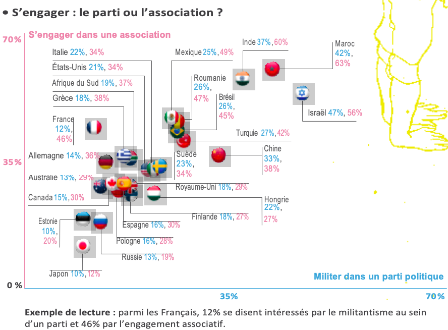 Deux cas particuliers sont à signaler : celui d’un pays démocratique et riche, Israël, dont la jeunesse exprime l’intérêt le plus fort pour le militantisme politique (47%) : celui de la Chine (33%), dont la portée reste à interpréter.