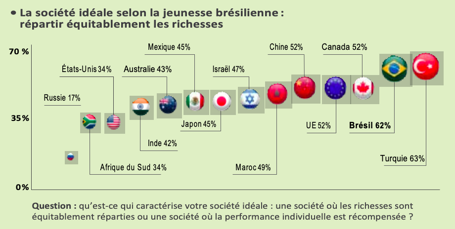 De même, les Brésiliens sont particulièrement égalitaristes : ils sont 62% à préférer une société où les richesses sont équitablement réparties à une société où la performance individuelle est récompensée, un niveau de réponses proche de la France ou des pays scandinaves, et très distinct de celui d’autres grands pays émergents : 42% des Indiens, 34% des Sud-Africains et seulement 17% des Russes préfèrent l’égalité à la performance individuelle. Plus frappant encore, 93% des Brésiliens estiment important pour eux de contribuer au bonheur des autres, contre 66% des Japonais, qui sont, de tous les jeunes interrogés, les plus à distance de cette idée.