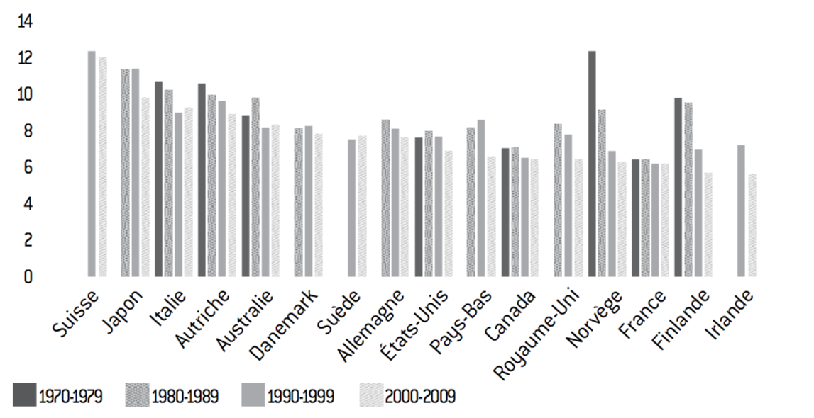 L’investissement des entreprises peut être affecté à différents postes : actifs incorporels, tels les brevets ou marques, ou actifs corporels, tels les terrains, les bâtiments et les machines. Le graphique 1 présente le taux d’investissement de la France en machines et équipements7 et le situe par rapport au taux des autres pays avancés de l’OCDE. Ce taux est particulièrement intéressant car il reflète mieux les décisions d’investissement des entreprises manufacturières, celles-ci y jouant un rôle plus important que dans le taux d’investissement global qui est principalement tiré par les services marchands et le commerce. Cette étude montre que la France accumule un retard au long cours depuis plusieurs décennies. En effet, son taux est l’un des plus faibles de l’OCDE, à 6,1% du PIB.