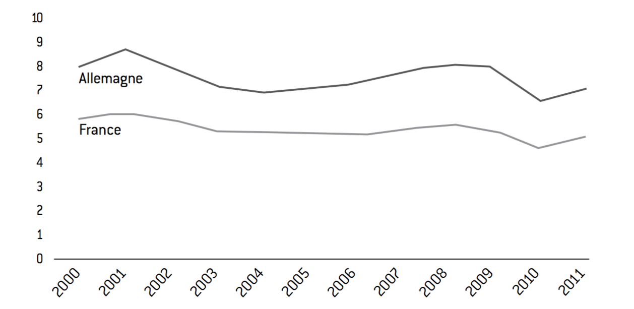 Dans une comparaison France/Allemagne, le taux d’investissement en machines et équipements rapporté au PIB représente 7,1% en Allemagne contre 5,1% en France, cet écart de 2% ayant été très régulier au cours de la dernière décennie.