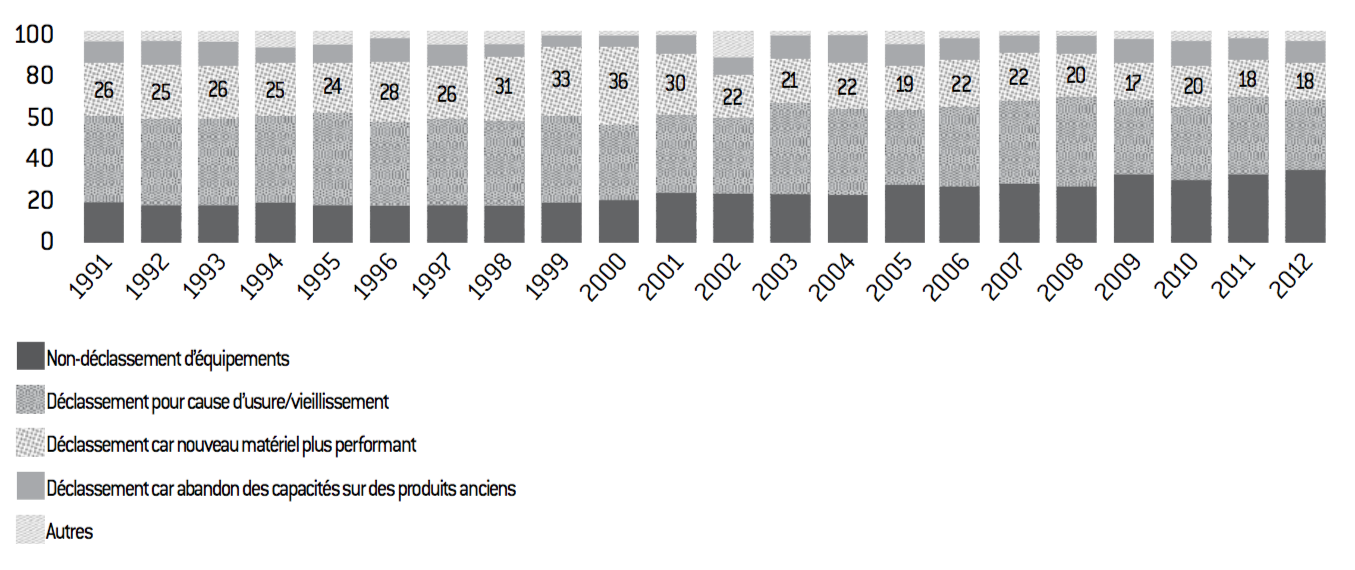Alors que la compétition internationale s’accroît et réclame un investissement de plus en plus important dans des équipements plus performants, l’industrie française a tendance à adopter un comportement conservateur en déclassant de moins en moins d’équipements et en essayant de prolonger la durée de vie des machines. Par exemple, alors que le nombre d’entreprises ne déclassant aucun équipement dans l’année était de 18% sur la période 1991-1996, puis de 19% sur la période 1996-2001, il est passé à 25% entre 2001 et 2006, jusqu’à atteindre 30% entre 2006 et 2011. Si la crise de 2009 a sans doute eu un impact, les autres périodes ne sont pas non plus exemptes de cycles de récession ou de ralentissement (1993, 1996, 2002, 2003). Les raisons mêmes du déclassement témoignent de ce comportement très prudent, puisque le déclassement d’un équipement ancien à la suite de l’acquisition d’un nouvel équipement plus performant représentait 38% des causes de déclassement sur la période 1996-2001 contre seulement 28% sur la période 2006-2011, soit une baisse de plus de 25%.