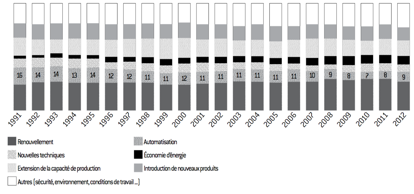 Si, en 2011, la part des décisions d’investissement motivées par l’objectif d’extension des capacités de production (14%) était en légère baisse par rapport à sa moyenne historique (15%), il est plus inquiétant de constater que, sur les deux dernières décennies, la hausse des décisions de renouvellement semble avoir été compensée par un recul des décisions de modernisation et de rationalisation. Une étude plus approfondie montre qu’au sein des décisions de modernisation et de rationalisation, c’est l’automatisation qui a le plus baissé, étant divisée par deux, passant de 16 à 9% entre 1991 et 2012. À titre d’information, en 1995, la France dépassait pourtant les États-Unis pour l’utilisation de robots manufacturiers et de systèmes automatisés de stockage-déstockage11.