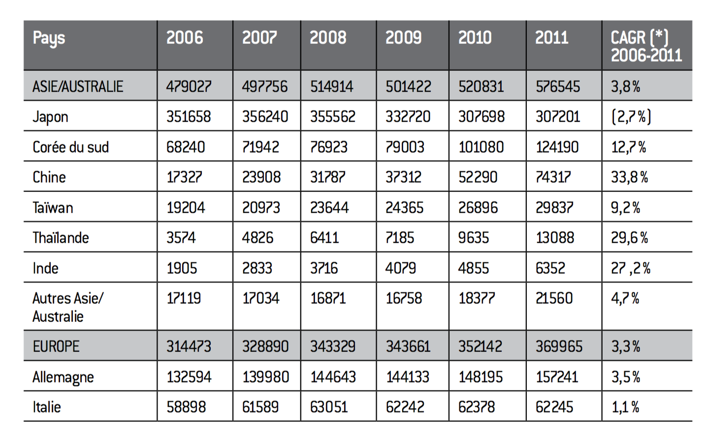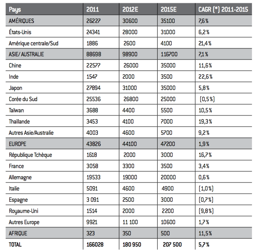 Les projections d’équipement sur la période 2011-2015 n’incitent pas à l’optimisme. Durant cette période, la croissance annuelle moyenne devrait être de 7,1% en Asie-Pacifique, de 6,2% en Amérique du Nord et seulement de 1,9% en Europe. En 2015, plus de 55% de la demande mondiale devrait venir d’Asie, dont 17% du Japon et également 17% de Chine, l’Europe et l’Amérique du Nord ne représentant respectivement que 23% et 15%. L’Inde devrait d’ailleurs avoir rattrapé la France en achats annuels de robots en 2015, en devenant ainsi le dixième plus gros installateur mondial.