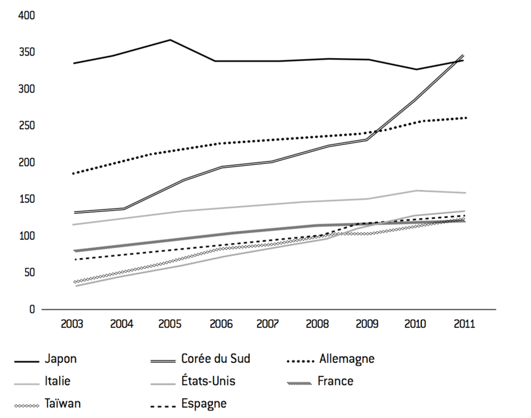 Le retard français est aussi visible au niveau des importations de robots industriels. S’il semble étrange de choisir comme indicateur de compétitivité l’importance des importations, la concentration des centres de production robotique oblige l’ensemble des pays, à l’exception du Japon, à recourir à des achats au-delà de leurs frontières. En outre, ces chiffres sont en valeur et apportent ainsi un éclairage complémentaire aux seuls achats de robots industriels en volume.