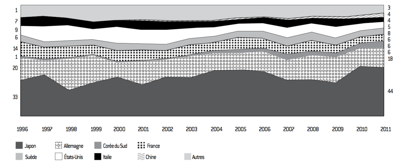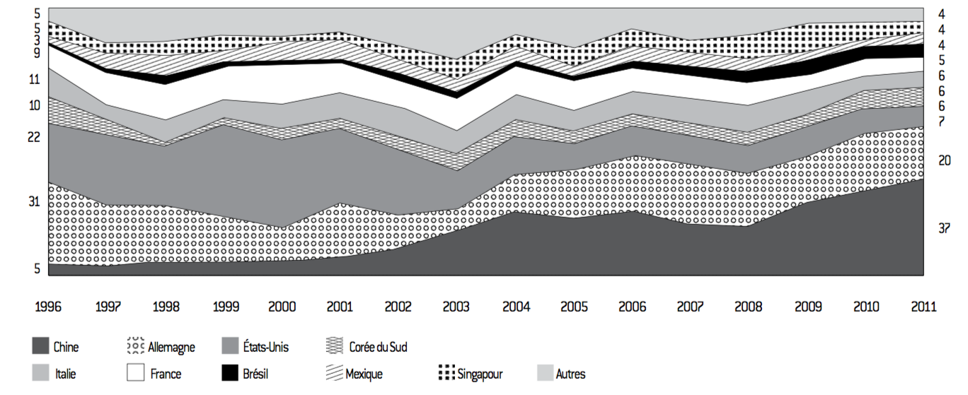 En l’absence de statistiques émanant de l’IFR à propos de la production en France, un indicateur fiable du niveau de production est la part de marché dans les exportations mondiales en valeur. Alors que la France occupait une position majeure dans les années 1990, exportant 12% des robots industriels mondiaux, à égalité avec les États-Unis, cette position n’a cessé de se dégrader, étant divisée par deux, au point de céder pour la première fois la troisième place mondiale à la Corée du Sud en 2011 et d’être talonnée par la Suède. La concurrence s’est en effet beaucoup accrue sur la période, les leaders japonais et allemands ayant respectivement augmenté et maintenu leurs parts de marché. Quant à la Corée du Sud et à la Chine, sous l’impulsion de plans de soutien massifs à la filière, elles ont largement pénétré le marché. Des acteurs comme la Suède et l’Italie ont réussi à préserver leurs parts de marché mondial grâce à leurs champions nationaux, ABB et Comau. Les exportations allemandes en recul sur la période 2000-2005, puis de nouveau orientées à la hausse sur les dernières années, ainsi que la croissance ininterrompue et très rapide des acteurs coréens et chinois, montrent que les positions concurrentielles sur le marché ne sont pas figées et sont susceptibles d’évoluer.