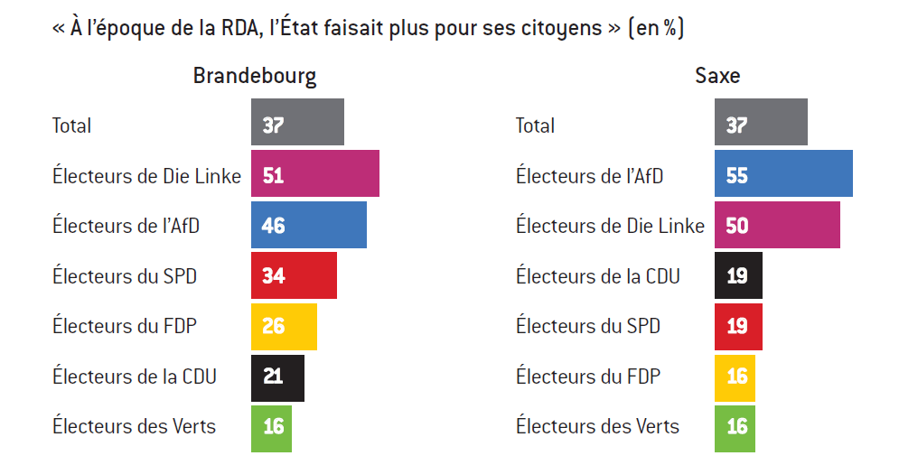 Dans le Brandebourg, près de 7 électeurs sur 10 (72%) considèrent que « les mentalités à l’Est et à l’Ouest demeurent différentes ». Cela concerne même plus de 8 électeurs de l’AfD sur 10 (83%). Une majorité de Saxons qui votent AfD (55%) jugent que les différences entre l’Est et l’Ouest se dont encore creusées ces dernières années. La nostalgie de la RDA fait même un retour étonnant puisque 37% des citoyens du Brandebourg interrogés sont d’accord avec l’affirmation « À l’époque de la RDA, l’État faisait plus pour ses citoyens », un sentiment particulièrement partagé par les électeurs de Die Linke (51%) et de l’AfD (46%). En Saxe, on trouve une tendance similaire : 37% sont d’accord avec cette idée et les électeurs de l’AfD sont une majorité à y souscrire (55%), suivis par ceux de Die Linke (50%).