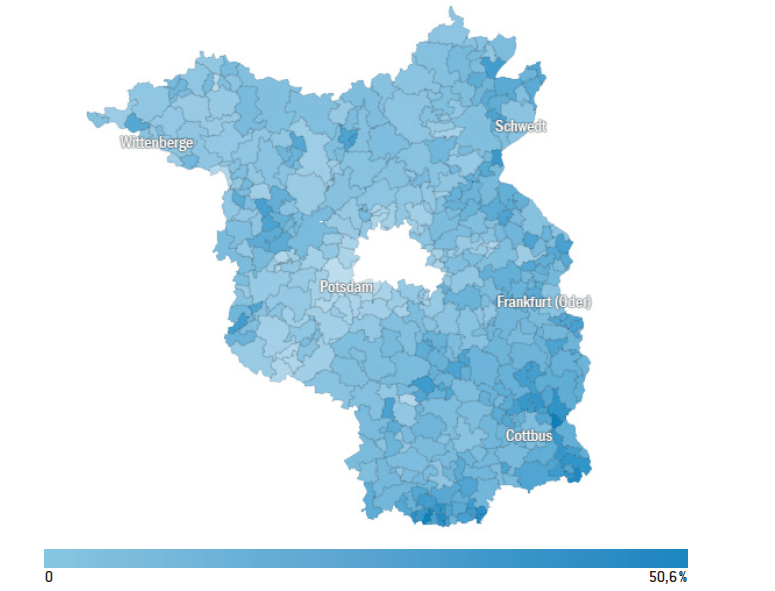La cartographie du vote AfD au Brandebourg, sur la page suivante, montre que le parti fait ses meilleurs scores dans la zone de production du charbon lignite, dont l’exploitation doit cesser à moyen terme. Le parti est fort dans les campagnes, largement désertifiées, à la frontière polonaise. La ceinture des zones électorales entourant Berlin montre en revanche une forte répulsion à l’AfD.