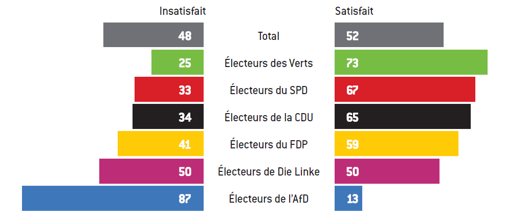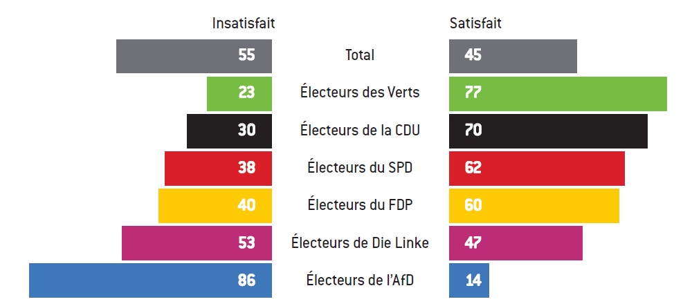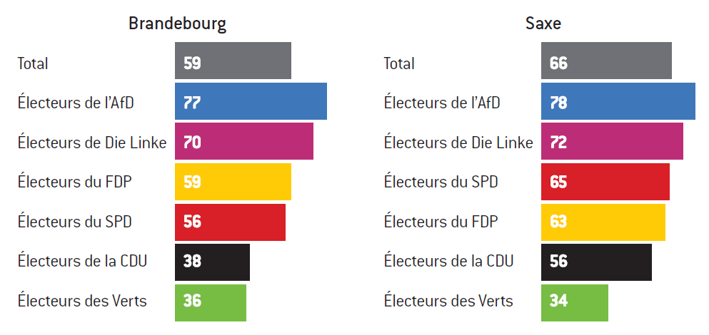 La perception de la démocratie en Allemagne est très contrastée en fonction des choix partisans. Au Brandebourg, 48% des citoyens interrogés sont insatisfaits du fonctionnement de la démocratie, 52% satisfaits. La ventilation par parti montre que 73% des électeurs des Verts sont satisfaits, 67% du SPD, 65% de la CDU, 59% du FDP, 50% de Die Linke et 13% seulement de l’AfD. En Saxe, 45% seulement des répondants croient que la démocratie fonctionne bien (mécontents : AfD 86%, Die Linke 53%, FDP 40%, SPD 38%, CDU 30%, Verts 23%).