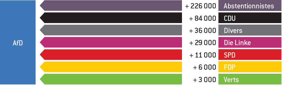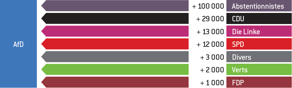 Au Brandebourg, comme on peut le voir sur le graphique ci-contre, l’AfD gagne gagne plus de 100.000 abstentionnistes mobiles, 29.000 électeurs en provenance de la CDU, 13.000 de Die Linke et 12.000 du SPD.