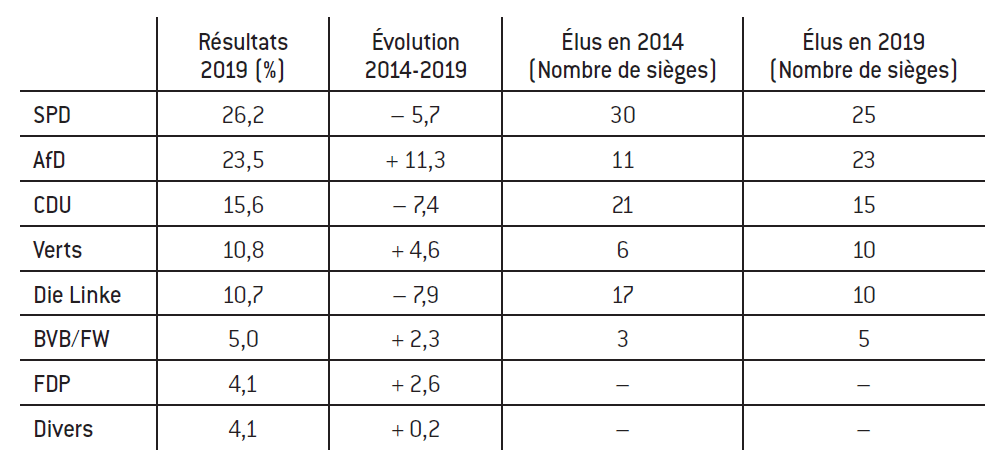 Historiquement, le SPD a dominé de manière ininterrompue la politique régionale dans le Brandebourg depuis 1990. Cette suprématie politique est aujourd’hui remise en cause. Dans ce Land vivant largement en symbiose économique et démographique avec l’État de Berlin, les sociaux-démocrates obtiennent 26,2 % mais enregistrent de lourdes pertes (– 5,7 points). L’écart par rapport à l’AfD est beaucoup plus faible qu’en Saxe. Avec 23,5 %, ce dernier parti double presque ses résultats de 2014. La CDU arrive en troisième position avec 15,6 % (– 7,4 points). Par rapport à la Saxe, les Verts progressent davantage (10,8 %, + 4,6 points) mais Die Linke reste le grand perdant de la consultation (10,7 %, – 7,9 points). Freie Wähler (FW) est représenté au Landtag (5 %, + 2,3 points), tandis que le FDP échoue à franchir la barre des 5 % (4,1 points).