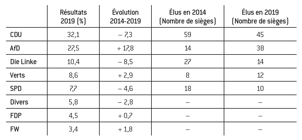 En Saxe, la CDU, dirigée par le ministre-président Michael Kretschmer, a obtenu 32,1% des suffrages. Au pouvoir depuis la réunification, les chrétiens- démocrates ont perdu 7,3 points, nombre de leurs électeurs étant passés à l’AfD (voir transferts électoraux ci-contre). Avec 10,4%, Die Linke est en troisième position et enregistre une lourde défaite (– 8,5 points), tout comme le SPD, dont l’effondrement s’accentue régionalement (7,7% des suffrages en 2019, – 4,6 points). Les Verts profitent marginalement de l’« effet Greta » (8,6%, + 2,9 points).
