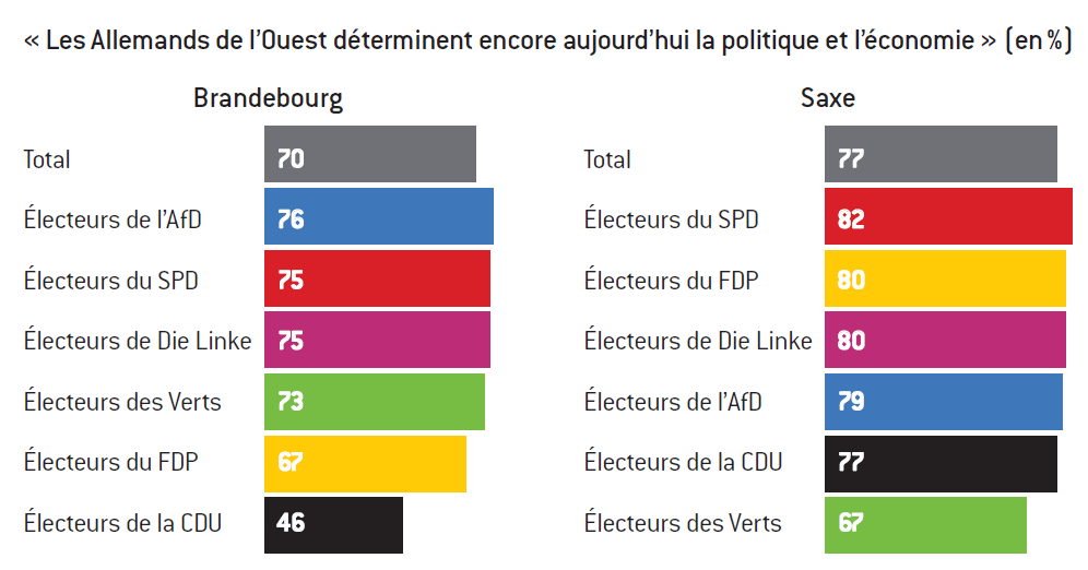 Un autre marqueur fort du malaise des nouveaux Bundesländer réside dans le fait que les Allemands de l’Ouest sont perçus comme dominant l’économie et la politique (70% des répondants en moyenne au Brandebourg, 76% des électeurs de l’AfD, 75% du SPD et de Die Linke, 73% des Verts, 67% du FDP et 46% de la CDU). En Saxe, 77% des répondants sont de cet avis (votants SPD 82%, FDP 80%, Die Linke 80%, AfD 79%, CDU 77%, Verts 67%).