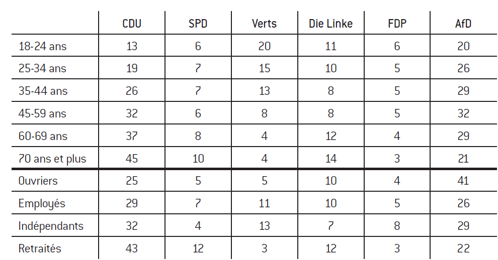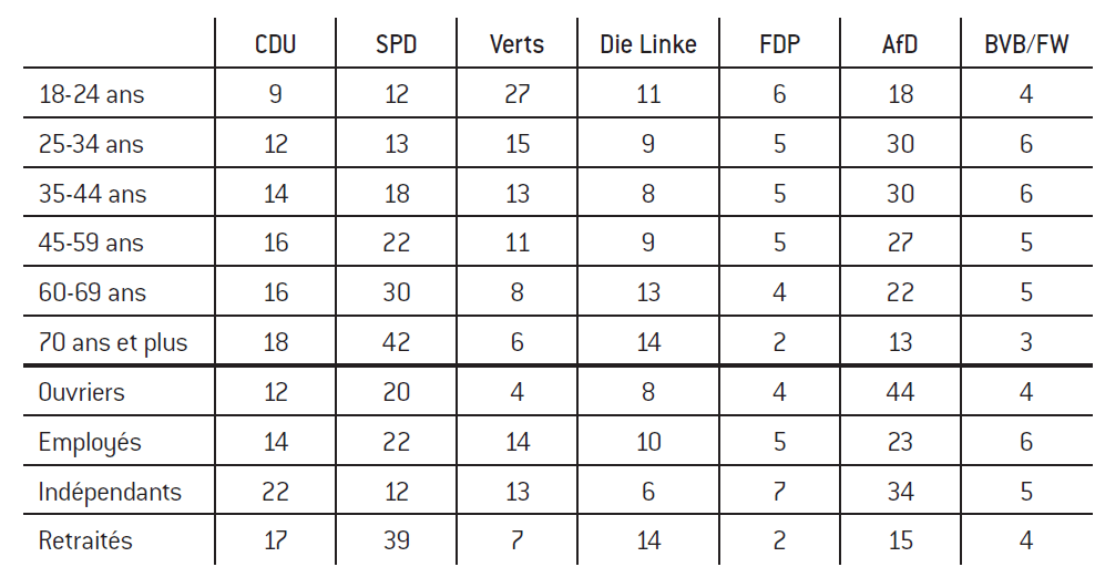 L’AfD en Saxe est le premier parti (ou arrive à égalité avec le parti de tête) dans quatre tranches d’âge. Ses résultats chez les 18-24 ans sont certes plus faibles, mais il demeure le parti qui a le plus de succès chez les jeunes, à égalité avec les Verts. La victoire relative de la CDU est due aux tranches d’âges 60-69 ans et 70 ans et plus, qui votent largement en sa faveur. Un signal inquiétant pour l’avenir. Sur le plan professionnel, l’AfD rassemble 41% des ouvriers et réalise un bon résultat chez les indépendants (29%). La CDU est le premier parti chez les retraités avec 43%.