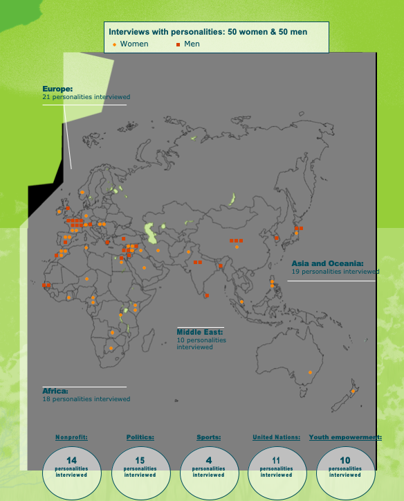 Finally, this summary presentation containing the preliminary findings of the quantitative survey has been supplemented and enhanced by quotations taken from interviews with the 100 personalities making up ScenaRio 2012’s special panel. This panel brings together prominent representatives of ten spheres of influence: politics, academia, media, business, nonprofit, creation & art, sports, intercultural dialogue, youth empowerment and the United Nations. The panel was structured according to two guiding principles, male-female parity and geographic balance. The interviews took place either in person or via telephone and e-mail and focused on eight questions regarding the importance of sustainable development. These participants were also encouraged to share their message with young people the world over in the form of a tweet. The complete list of personalities who took part in ScenaRio 2012 as well as each of their messages appear at the end of this publication.