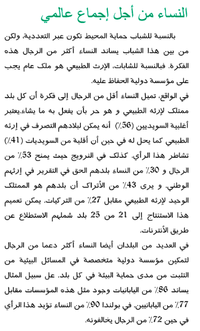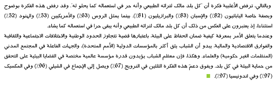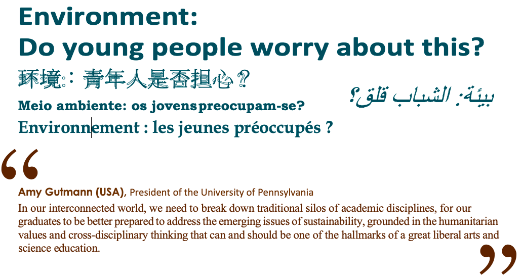 Os resultados desta enquete mostram que os jovens sabem adotar uma postura planetária no que concerne o meio ambiente. Assim, a maioria deles rejeita a ideia segundo a qual “cada país tem sua própria herança natural e pode usá-la como quiser”. A rejeição desta ideia é notavelmente clara entre os japoneses (82%), os espanhóis (83%) ou os brasileiros (81%). A exceção são os russos (63 %), os americanos (53%) e os indianos (52%), que estimam, contrariamente, que cada país é proprietário da sua herança natural e que permanece livre para utilisá-la como desejar.