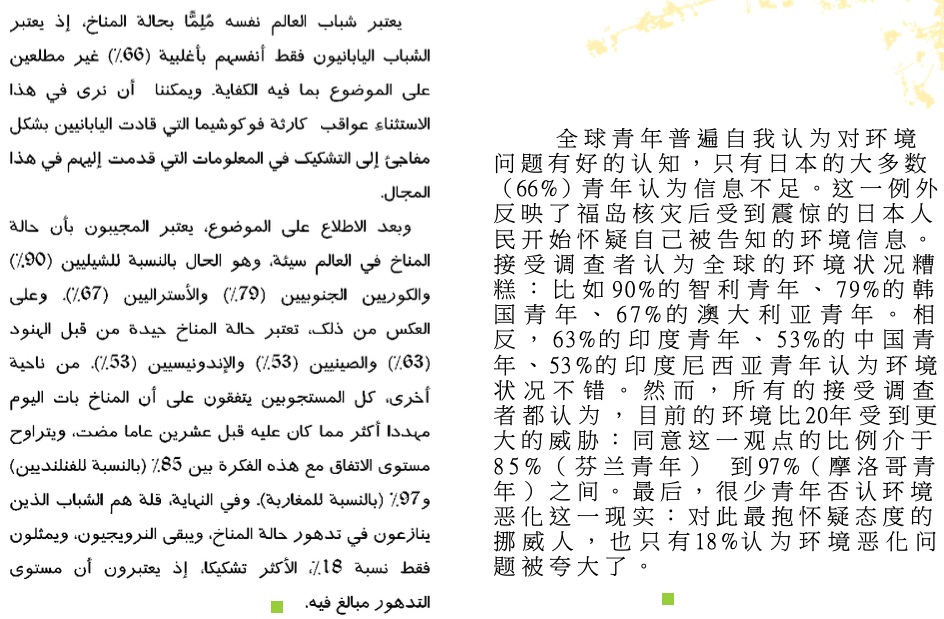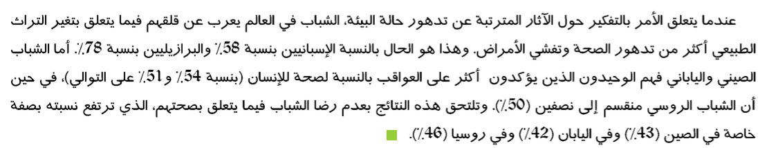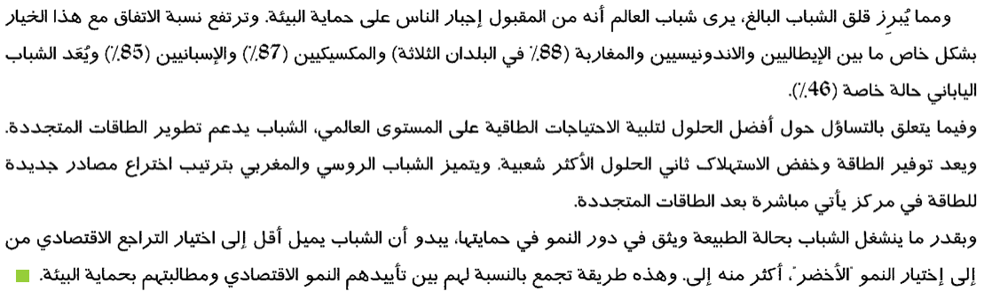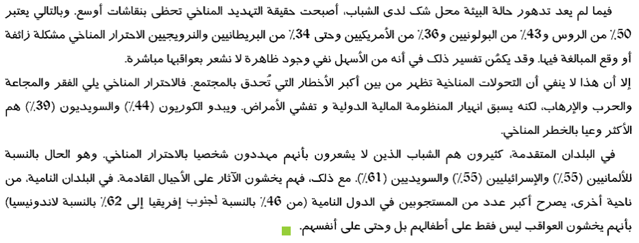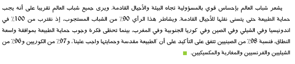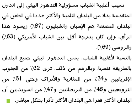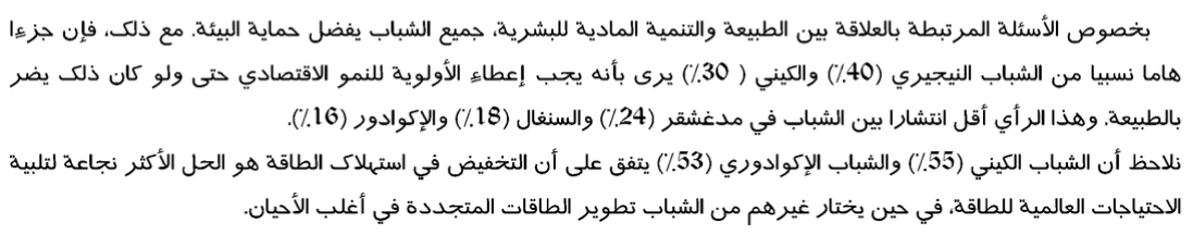 然而,当被邀请在发展经济和保护环境二者中做出选择时,大多数的年轻人认为应优先考虑环境保护,即使这样会减慢经济发展。比如, 95 %的墨西哥青年、 94 %的摩洛哥青年、 93 % 的 中 国 青 年 、 9 2 % 的 智 利 、 印 度 尼西 亚 和 巴 西 青 年 认 为 环 境 优 先 于 经济发展。引人注意的是,约三分之一(30 %)的美国青年认为应优先考虑经济发展,即使这样会对环境造成负面影响。这一数据可能可以证明美国在环境保护重视的加强。