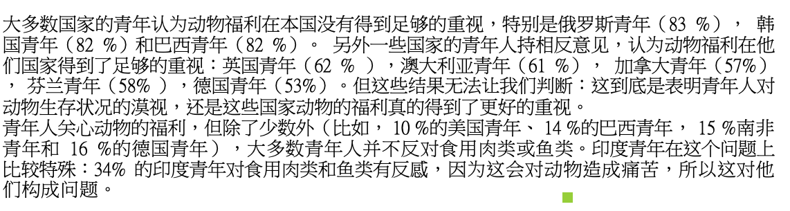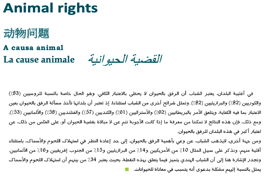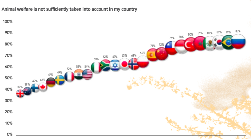 Na maioria dos países, os jovens estimam que o bem-estar dos animais não é suficientemente levado em conta. É o caso, em especial, dos russos (83%), dos coreanos (82%) e dos brasileiros (82%). Já outros jovens são exceção e estimam que o bem-estar dos animais é suficientemente levado em conta nos seus respectivos países: britânicos (62%), australianos (61%), canadenses (57%), finlandeses (58%) e alemães (53%). Entretanto, esses resultados não nos permitem saber se essas respostas traduzem um desinteresse pela causa animal ou, bem ao contrário, a existência nesses países de uma consciência mais aguçada em prol do bem-estar dos animais.