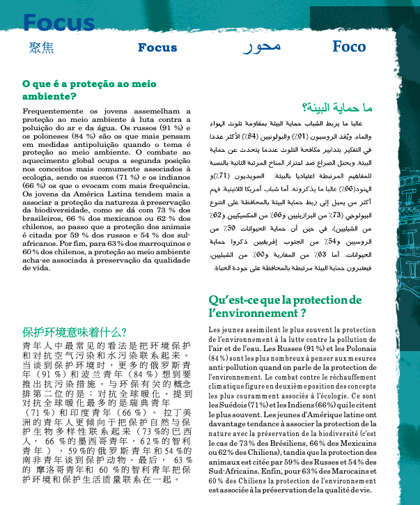 Embora a maior parte dos jovens relacione a proteção ao meio ambiente com a luta contra a poluição, os jovens latino-americanos frisam a preservação da biodiversidade (40% dos brasileiros, 33% dos mexicanos e 28% dos equatorianos e dos chilenos citam este critério em primeiro lugar).