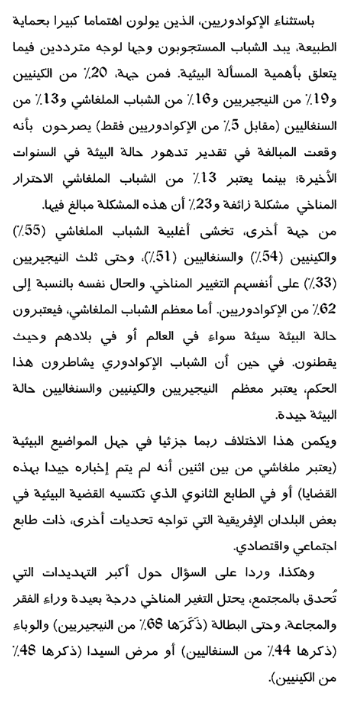 除非常关心保护自然的厄瓜多尔青年外 , 接 受 面 对 面 调 查 的 年 轻 人 看 起来对环境问题的重要性犹豫不决。一方 面 , 20%的 肯 尼 亚 青 年 , 19%的 尼日利亚青年, 16 %的马达加斯加青年和 13%的塞内加尔青年(于此相比, 只 有 5% 厄 瓜 多 尔 青 年 ) 认 为 环 境 恶化问题在近几年中被夸大; 13%的马达 加 斯 加 青 年 认 为 全 球 暖 化 问 题 不存在, 23 %认为全球暖化问题被夸大了。另一方面,大多数的马达加斯加青年(55%)、 肯尼亚青年(54% )、塞 内 加 尔 青 年 (51% )以 及 三 分 之 一的 尼 日 利 亚 青 年 (33% )担 心 全 球 暖化对他们有影响。这一比例在厄瓜多尔青年中高达 62 %。大多数马达加斯加青年认为全球环境以及他们所居住国家和地区的环境状况糟糕。厄瓜多尔青年也持同样看法,相反大多数尼日利亚青年、肯尼亚青年和塞内加尔青年认为环境状况良好。