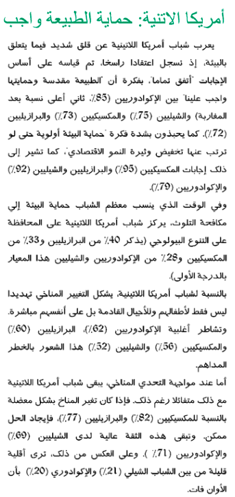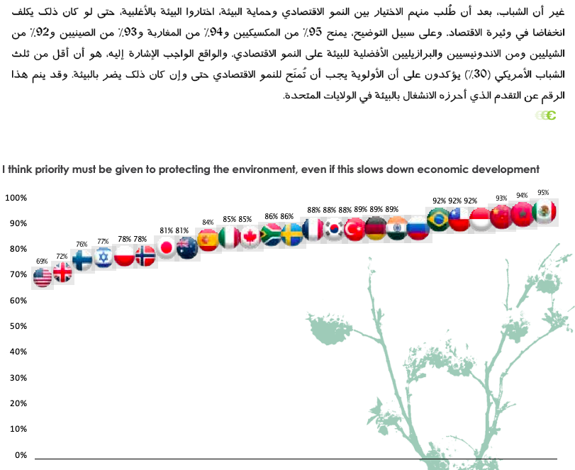 No entanto, convidados a escolher entre o desenvolvimento econômico e a proteção ao meio ambiente, os jovens optam majoritariamente pela ecologia, ainda que à custa de uma desaceleração econômica. A título de ilustração, 95% dos mexicanos, 94% dos marroquinos, 93% dos chineses e 92% dos chilenos, dos indonésios ou dos brasileiros priorizam o meio ambiente, não o desenvolvimento econômico. Vale notar que menos de um terço dos jovens americanos (30%) afirma que a prioridade é favorecer o desenvolvimento econômico ainda que isto resulte em danos ao meio ambiente. Esta cifra pode ser sinal de progresso no que diz respeito à preocupação com o meio ambiente nos Estados Unidos.