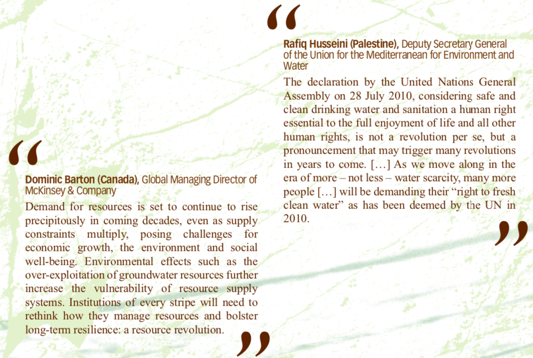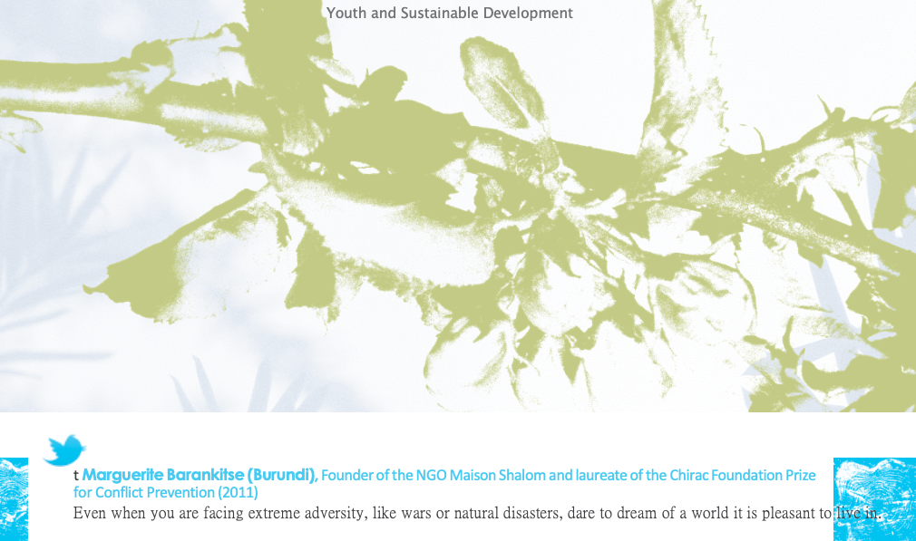 This publication, to be presented at the Rio+20 Conference on the occasion of a number of official events organised with our United Nations partners¹, suggests a number of paths to be explored. It seeks in particular to initiate a dialogue between generations, highlighting the views expressed by young people and backing them up with quotations from interviews conducted with 100 prominent people who have rallied around our cause and actively participated in our initiative. This study is published in five languages and demonstrates our determination to promote thought and discussion not only at a global level but also in the setting of the new world. It will be expanded in a more developed publication that we will produce before the end of the year.