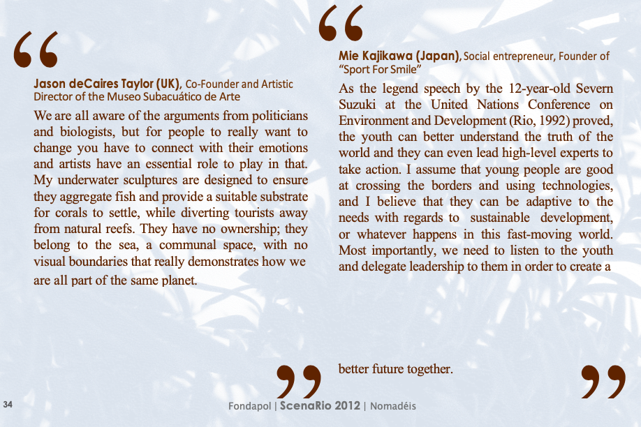 ScénaRio2012 the first worldwide survey on youth and sustainable development, arose from the common intention of the Fondation pour l’innovation politique and Nomadéis to bring an innovative contribution to the United Nations conference on sustainable development that is taking place in Rio de Janeiro from the 20th to the 22nd of June 2012.