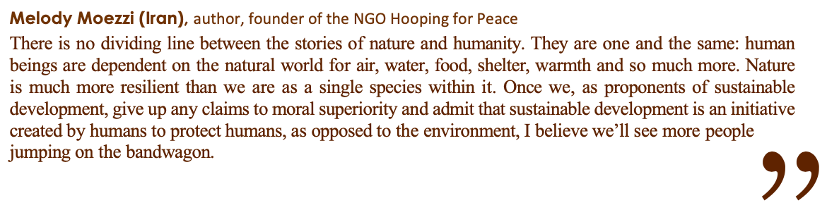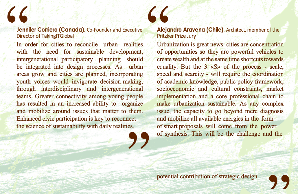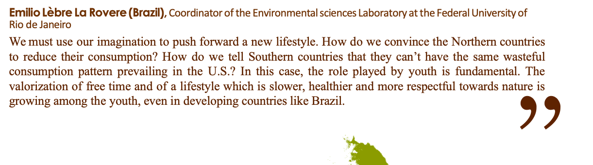 Young people have a full understanding of today’s world; they know how to identify what promises and opportunities it holds. They advocate for an ideal world but they do not live outside present day realities: access to education, housing, jobs, water and energy services, etc. Aware that tensions over the environment are often the product of a clash between the ideal world and reality, they express their wish for increased protection of natural resources while supporting a vision of human reality that places greater emphasis on quality and rejects the idea that progress is simply a matter of economic growth or technological innovation.