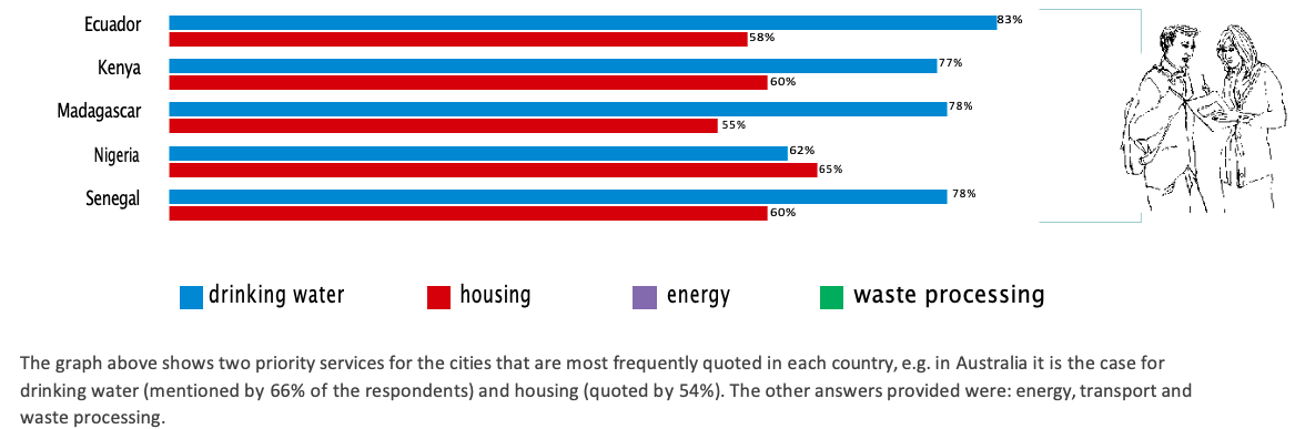 Para a pergunta sobre quais serviços as cidades devem oferecer prioritariamente aos seus habitantes, água potável e habitação foram os dois mais comumente citados. Não surpreende a constatação de que o primeiro serviço da lista seja água potável na maioria dos casos. Os franceses, os israelenses, os russos, os marroquinos, os chineses e os nigerianos colocam habitação antes de água potável. Energia é citada pela maioria dos japoneses e por grande parte de alemães, de turcos, de coreanos e de americanos. Por outro lado é grande a quantidade de italianos, de indonésios e de indianos que consideram o tratamento do lixo como um serviço que as cidades deveriam assegurar prioritariamente.