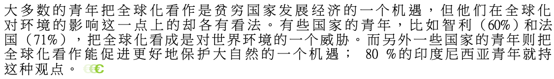 同 参 与 网 上 问 卷 调 查 国 家 的 青 年 一 样 , 参 与 面 对 面 调 查 的 青 年 也 赞 同 全 球 化所 代 表 的 更 多 是 机 会 而 非 威 胁 , 如 88 %的 尼 日 利 亚 青 年 、 81 %的 塞 内 加 尔 青年、 66 %的马达加斯加青年和 52 %的厄瓜多尔青年。同样,这些国家的青年人把全球化看作既是贫穷国家发展经济的机遇,也是更好地保护大自然的一个机遇。 看法不统一的主要是肯尼亚青年: 43 %的肯尼亚青年认为全球化是一个机遇, 34 %认为是威胁,另外四分之一的肯尼亚青年则认为对此问题不知道如何回答。