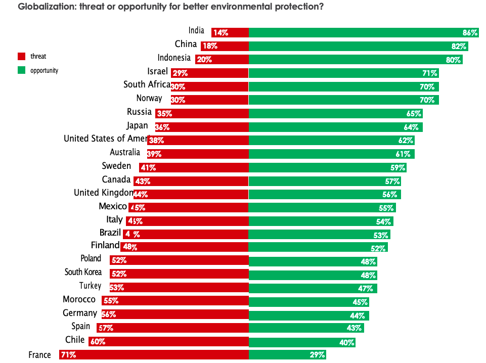 É verdade que a grande maioria dos jovens vê na globalização uma oportunidade para o desenvolvimento dos países mais pobres, mas as opiniões são mais divergentes quanto ao seu potencial de impacto sobre o meio ambiente. Assim, para inúmeros chilenos (60%) e franceses (71%), a mundialização é uma ameaça para o meio ambiente. É preciso notar, porém, que já em outros países os jovens consideram a globalização como uma oportunidade que permite proteger a natureza mais eficazmente. É o que se dá, por exemplo, no caso de 80 % dos indonésios.