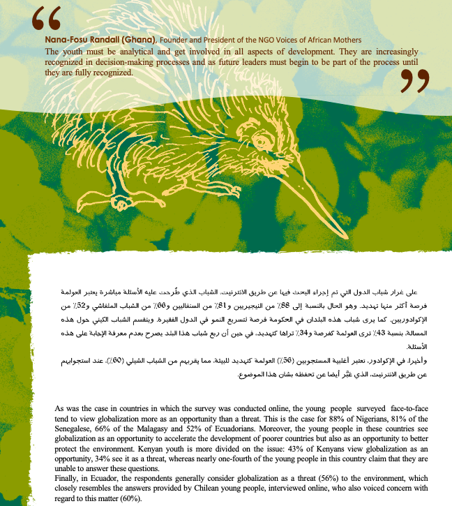 Como no caso dos jovens nos países em que a enquete foi realizada via internet, os jovens entrevistados face a face consideram a mundialização mais como oportunidade do que como ameaça. É o caso de 88% dos nigerianos, 81% dos senegaleses, 66% dos malgaches e 52% dos equatorianos. Os jovens desses países também veem na globalização uma oportunidade para acelerar o desenvolvimento dos países pobres, mas igualmente para proteger o meio ambiente de forma mais eficaz. A juventude queniana está mais dividida: 43% dos quenianos veem a mundialização como oportunidade; 34% a veem como ameaça; e os demais (quase um quarto) dizem não saber responder a essas perguntas.
