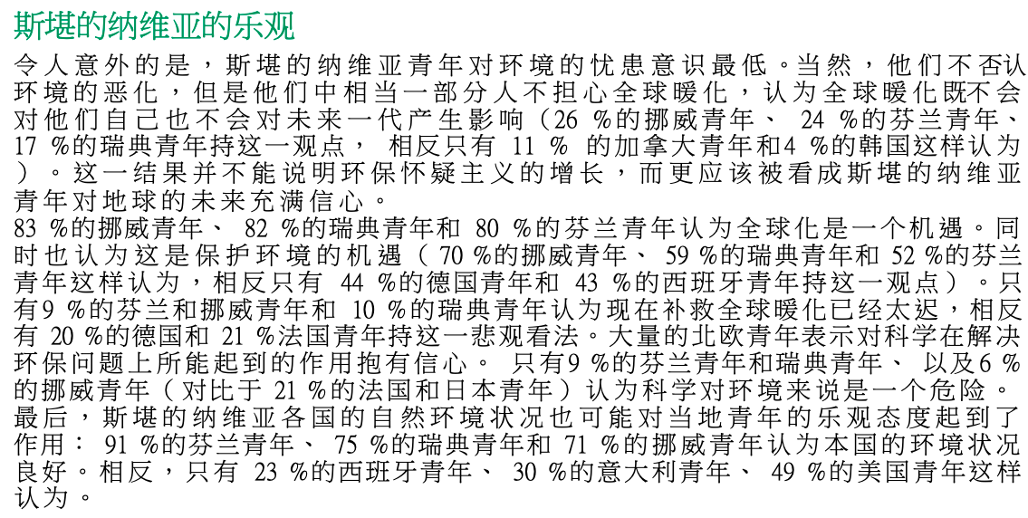 Surpreendentemente, os escandinavos fazem parte dos jovens menos preocupados com a situação do meio ambiente. É verdade que não ignoram sua degradação, mas uma parte relativamente importante deles não teme o aquecimento global nem por si próprios nem pelas gerações futuras (como é o caso de 26% dos noruegueses, 24% dos finlandeses e 17% dos suecos, contra somente 11% dos canadenses ou 4% dos coreanos). Estes resultados podem ser indício menos de um crescente ecocepticismo do que do otimismo que caracteriza a visão que os jovens escandinavos têm do futuro do planeta.