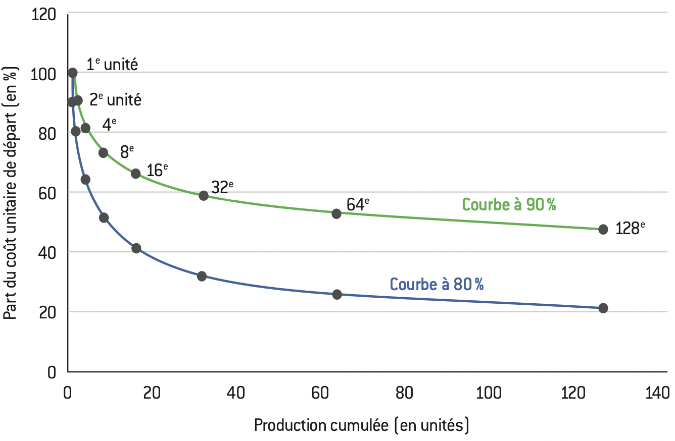 Le graphique ci-après représente une courbe d’expérience à 90 et à 80%. Si l’on prend le cas de la courbe à 90% (en vert), cela signifie que chaque fois que la production cumulée de l’entreprise double, le coût unitaire diminue de 10%, grâce à l’expérience acquise. Supposons que l’entreprise fabrique une seule unité de produit par période de temps : lorsque l’entreprise est à la deuxième période, elle a donc produit au total deux unités et son coût unitaire aura baissé de 10% par rapport à la première unité. Lorsqu’elle aura produit quatre unités (au bout de quatre périodes), son coût unitaire sera égal à (0,9)^², soit 0,81 du coût de la première unité. Dans le cas d’une courbe à 80% (en bleu), chaque fois que la production cumulée double, le coût unitaire diminue de 20%. Nous pouvons appliquer le principe de la courbe d’expérience à une situation dans laquelle l’industrie domestique se trouve en retard par rapport à ses concurrentes étrangères. Supposons, par exemple, que l’industrie domestique soit présente depuis quatre périodes seulement dans un secteur qui présente une courbe d’expérience de 10% : son coût unitaire de production est donc égal à 81% de celui de la première unité. Les entreprises étrangères sont quant à elles présentes dans le même secteur avec la même technologie mais depuis 32 périodes : leur coût unitaire de production est égal à (0,9)^5, soit 59% de celui de la première unité. L’entreprise domestique supporte donc un désavantage de coût par rapport à ses concurrentes étrangères qui résulte uniquement de son entrée plus tardive sur le marché. |
