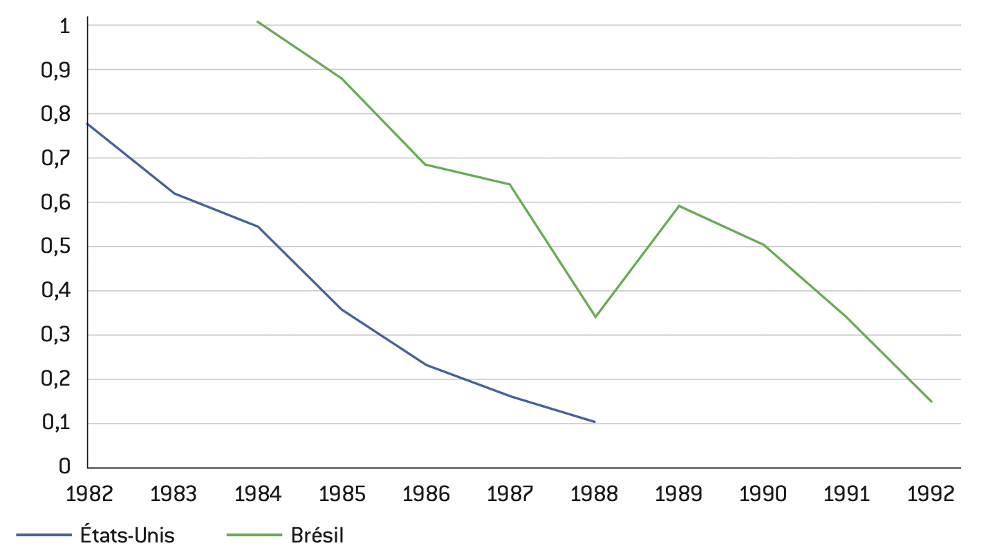 Ce cas de figure n’a rien de théorique et peut être illustré par le cas du Brésil, qui a mis en œuvre une politique de rattrapage au cours des années 1980 dans le secteur de la production d’ordinateurs personnels 49. Cette politique a été un échec : en effet, l’industrie brésilienne d’ordinateurs a bien vu ses performances technologiques augmenter mais n’a jamais réussi à rattraper le retard avec les leaders du secteur (à savoir les entreprises américaines IBM et Apple), compte tenu de l’évolution permanente de la performance des ordinateurs. Le graphique ci-après représente le ratio prix/performance des ordinateurs américains et brésiliens au cours de la période 1982-1992. Bien que dans les deux cas la performance des ordinateurs s’améliore au cours du temps (ce qui se traduit par une diminution de la courbe), il existe toujours un écart entre les deux pays, de trois à six ans. Par exemple, nous voyons que le ratio prix/performance des ordinateurs brésiliens en 1990 est égal à celui obtenu par les ordinateurs américains en 1984, soit un écart de six ans.