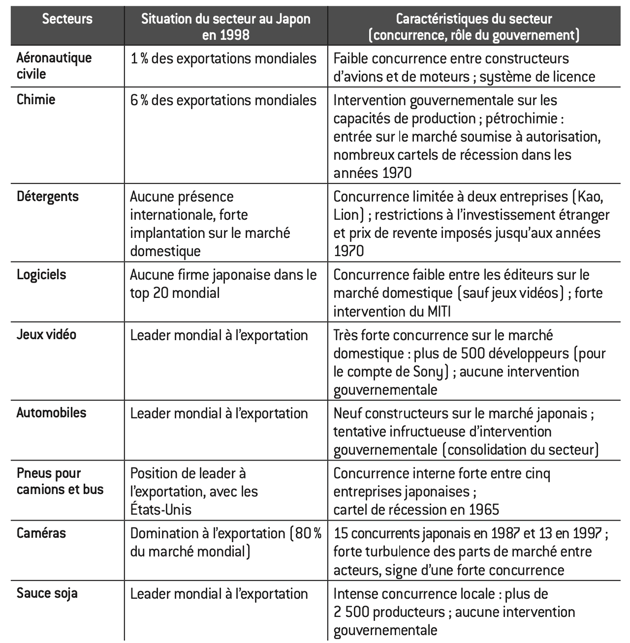 Le rôle de la concurrence domestique dans le rattrapage japonais Dans une étude parue en 2004*, des chercheurs ont distingué deux types d’industries au Japon (voir tableau ci-dessous) :
