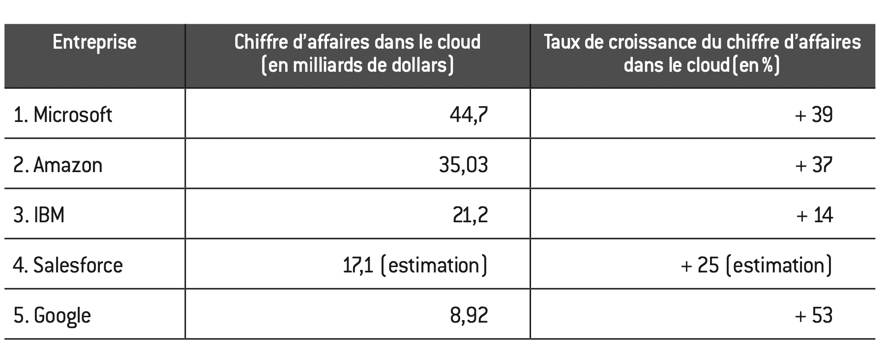 Les cinq premières entreprises mondiales du cloud en termes de revenus (2019)