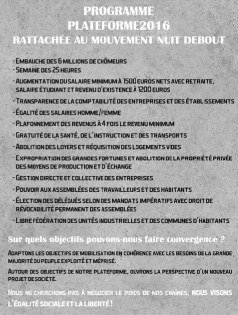 Certains membres de la gauche radicale, notamment des militants regroupés autour du journal Fakir et de son journaliste vedette François Ruffin, se retrouvent à la Bourse du travail de Paris. Déjà, début 2015, une opération similaire avait été lancée mais les événements dramatiques du mois de janvier avaient empêché le projet d’aboutir, en dépit d’une réunion importante tenue le 12 janvier 2015 qui avait rassemblé quelque 300 personnes34. En 2016, Ruffin vient d’achever la promotion de son film Merci Patron !, qui dénonce le propriétaire du groupe LVMH, Bernard Arnault, selon un modèle analogue à celui qu’avaient utilisé le cinéaste américain Michael Moore, notamment dans Roger et Moi en 1989, et, plus récemment, Pierre Carles, dans Pas vu pas pris en 1998, ainsi que ses épigones Gilles Balbastre et Yannick Kergoat, dans Les Nouveaux Chiens de garde en 2012, film qui s’attache à mettre en évidence le journalisme de connivence et les relations des journalistes avec le monde politique et patronal. Ruffin est soutenu par Fréderic Lordon et l’équipe du Monde diplomatique, avec par exemple un long article paru dans ce journal en février 2016. Une première réunion publique a lieu le 23 février 2016 dans laquelle germe l’idée de lancer un mouvement similaire à celui qui a pu naître en Espagne, à la Puerta del Sol en mai 2011, et qui a donné naissance à Podemos, ou à celui d’Occupy Wall Street, à New York, en septembre 2011.