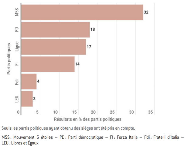 Le taux de participation aux élections du 4 mars 2018 (73%) peut être analysé de deux façons. Si on le compare avec les taux de participation italiens de l’après-guerre, il est très bas et il s’agit même de l’abstention record pour des législatives en Italie. Néanmoins, ce taux est tout à fait respectable par rapport à ceux d’autres pays démocratiques : il est, par exemple, par rapport à la France, largement supérieur au taux de participation des élections législatives et égal à celui du second tour de l’élection présidentielle française de 2017. Le résultat des urnes, surprenant par rapport aux prévisions de plusieurs sondages, a été marqué par le franc succès du M5S.