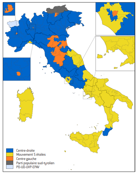 La carte géographique indiquant la répartition des sièges des élus au suffrage majoritaire est riche d’enseignements. On constate en effet l’existence d’une authentique fracture territoriale entre un Nord massivement rattaché à la Ligue (et traditionnellement favorable à la droite) et un Sud soutenant largement le M5S. Ces résultats traduisent le succès, surtout au Sud, de la promesse pentastellata – c’est-à-dire dans le jargon politique italien tout ce qui fait référence aux cinq (penta) étoiles (stelle) – d’un « revenu de citoyenneté » promu par le M5S. Par ailleurs, ces résultats électoraux démontrent également la popularité, surtout au Nord, des mots d’ordre de la Ligue et, plus généralement, de l’ensemble de la droite relatifs à la baisse de la charge fiscale. Concernant le centre gauche, on constate que celui-ci, littéralement pris en tenaille entre ces deux Italie, n’obtient que des miettes en termes de sièges uninominaux. Quant à la gauche radicale, sortie du PD pour créer le mouvement Liberi e Uguali (« Libres et Égaux », LEU), elle n’obtient aucun parlementaire et son échec est cuisant, malgré la présence dans ses rangs d’un personnage important de la gauche italienne, l’ex-président du Conseil Massimo D’Alema.