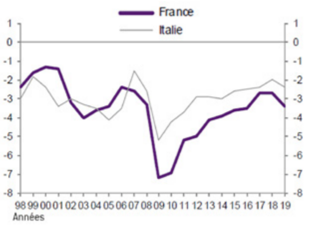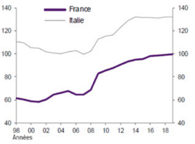 En calculant la dette publique sur la base de la population, en 2019 chaque Italien est endetté d’environ 38.000 euros. Les graphiques ci-dessous comparent ainsi les évolutions des dettes publiques italienne et française.