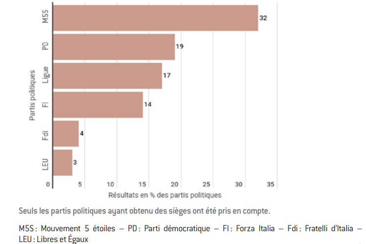 Dès les élections législatives de 2013, ce mouvement s’était imposé comme le premier parti national (25,6 % à la Chambre des députés), mais avait été dépassé par la coalition de droite (29,2%) et par celle de centre gauche (29,6%). Amplifiés par la loi électorale de l’époque, ces résultats avaient attribué 108 sièges sur 630 au M5S, 124 à la coalition de droite et 344 à celle de centre gauche. Cinq ans plus tard, le 4 mars 2018, le M5S obtient cette fois 10,7 millions de voix (32,7%) à la Chambre des députés et 9,75 millions de voix (32,2%) au Sénat. Début 2019, sa présence parlementaire, bien qu’amputée par l’exclusion de quelques dissidents, s’élève à 220 députés et à 107 sénateurs.