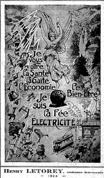 « Je vous offre la santé, la gaieté, le bien-être, je suis la Fée Électricité », couverture de Henri Letorey, 1923
