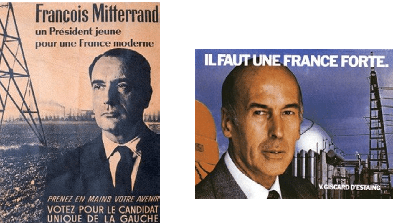 Affiches de campagne électorale de François Mitterrand (1965) et de Valéry Giscard d’Estaing (1981).